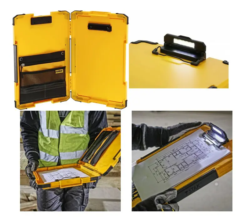 Písacia podložka DeWALT s vnútorným úložným priestorom ideálna pre prenášanie dokumentov (napr. predstavenie cenových ponúk a fakturáciu) alebo uloženie mobilného telefónu v bezpečí pred poškodením. Písacie dosky sú navyše plne kompatibilné so systémom Tstak, ku ktorému možno ľahko uchytiť jednoduchým zacvaknutím.