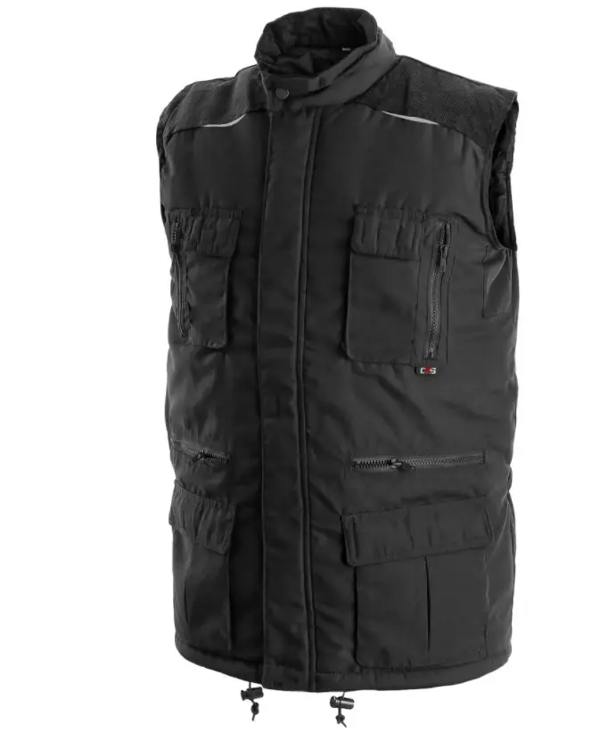 Zateplená vesta, ramená a golier pošitý manšestrom, pružné stiahnutie prieramku, možnosť stiahnutia vesty v páse, 14 vreciek - z toho 3 vrecká...
