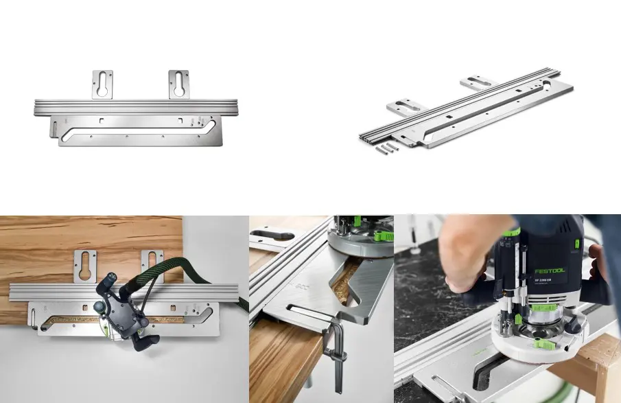 - Navyše s dvomi ľubovoľne umiestniteľnými frézovacími šablónami na zapustenie bežných spájacích kovaní na dolnej strane dosky