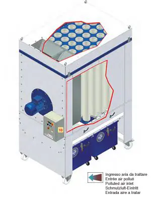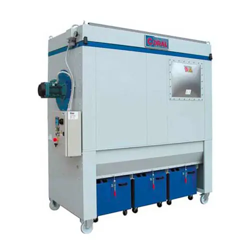Filtre Coral sú vysoko účinné čističe prachu s vlastným plne automatickým čistením vstrekovaním stlačeného vzduchu. Jednotka má mimoriadne robustnú konštrukciu s individuálnymi, zosilnenými, lakovanými oceľovými panelmi a pozostáva z hornej odsávacej komory so systémom čistenia stlačeného vzduchu, centrálnej časti, v ktorej sú umiestnené filtračné vrecká, a spodnej časti s opornými nohami, násypkou a znečisteným vzduchom. prívod. Tieto filtre sú navrhnuté tak, aby pracovali vo vákuu podľa nasledujúceho procesu: kontaminovaný vzduch vstupuje zo vstupu násypky a v dôsledku silného poklesu rýchlosti padajú väčšie častice do odpadkového koša na kolieskach.
