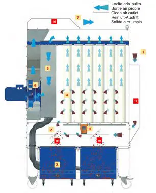 K dispozícii je aj verzia s predkomorou (CC) vrátane predsystému na padanie vysoko koncentrovaného prachu. Tu sa prívod vzduchu neuskutočňuje v násypke, ale priamo v predkomore. Alternatívne môže byť násypka vybavená rotačným ventilom a vypúšťacou skrutkou (CVS). Čistenie vrecových filtrov je zaručené systémom spätného preplachovania stlačeného vzduchu riadeným depressure cyklickým programátorom (PLC), ktorý automaticky aktivuje solenoidové ventily a súčasne čistí rad filtračných vreciek. Týmto spôsobom sa dosiahnu celkom konštantné straty zaťaženia a prúdenie vzduchu.
